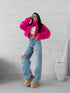 The VESPERA women's jacket offers a blend of elegance and comfort with its delicate, soft material that imitates fur. Its short, fitted cut beautifully highlights the silhouette, while the gold logo zipper and high stand-up collar add a refined, sophisticated touch. A gold brand logo on the back completes the design, lending a subtle sense of luxury.